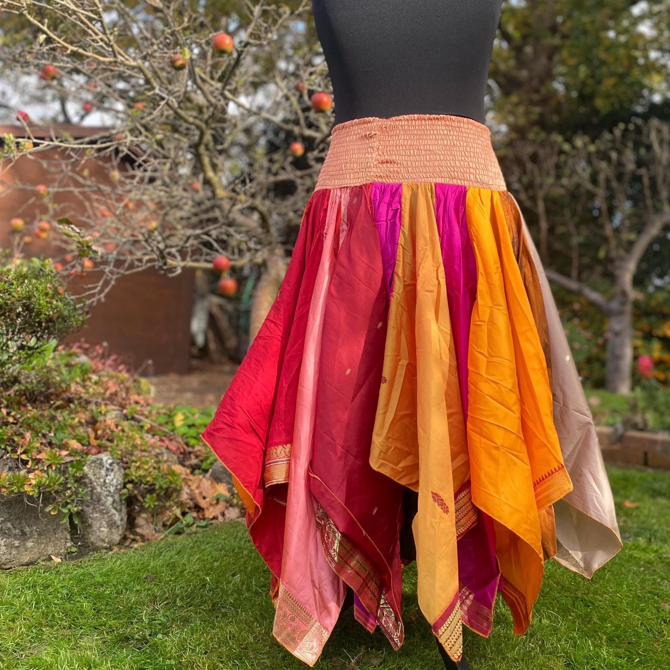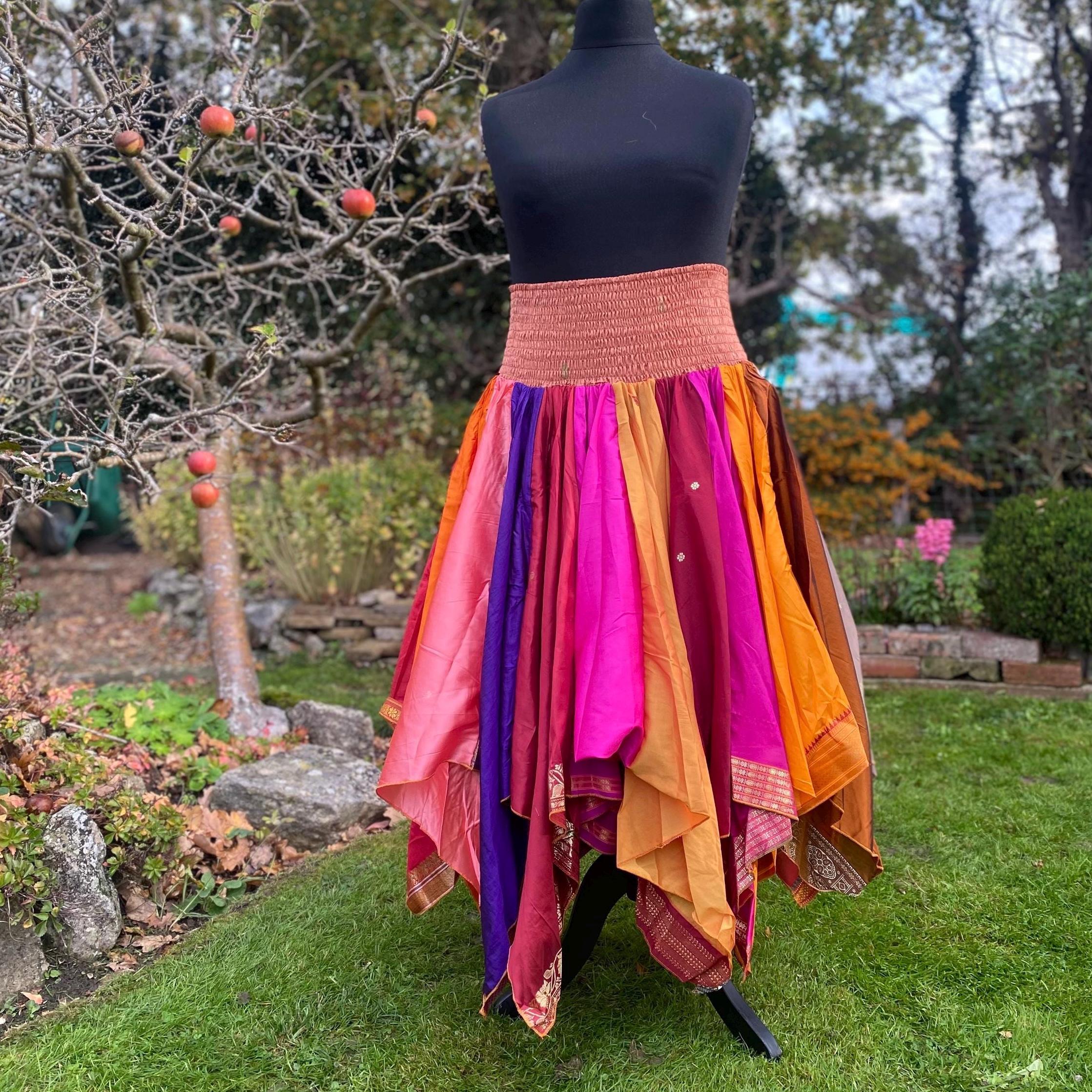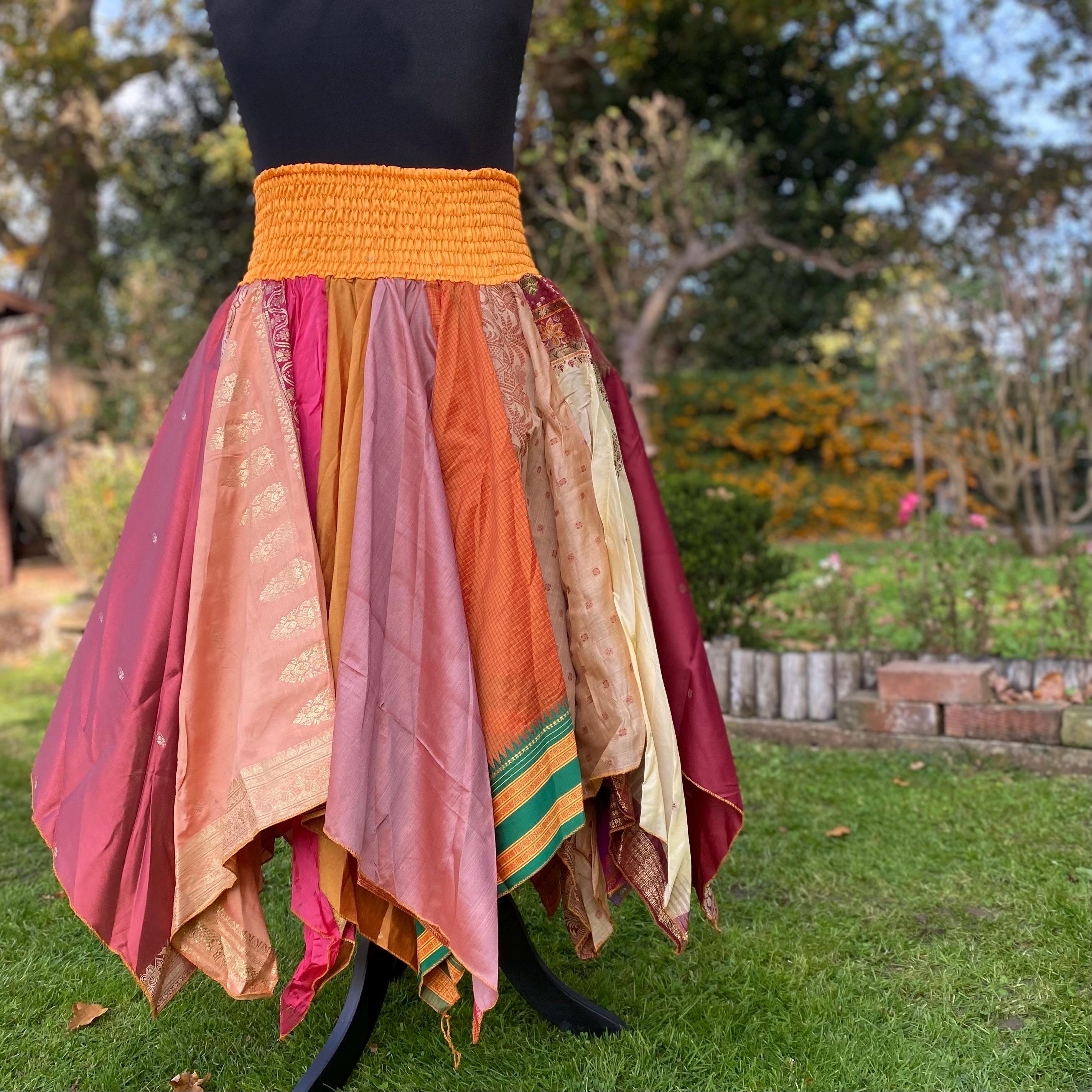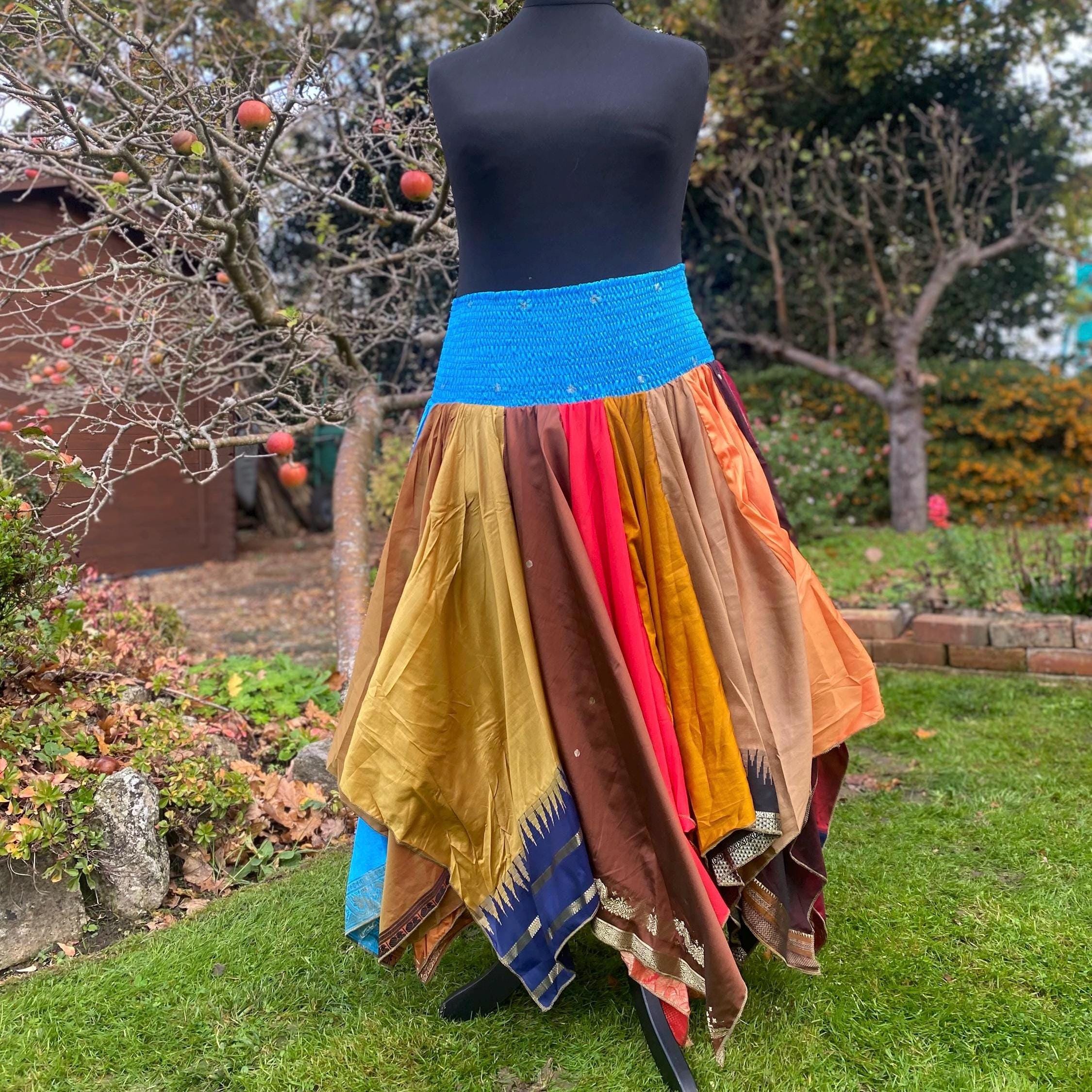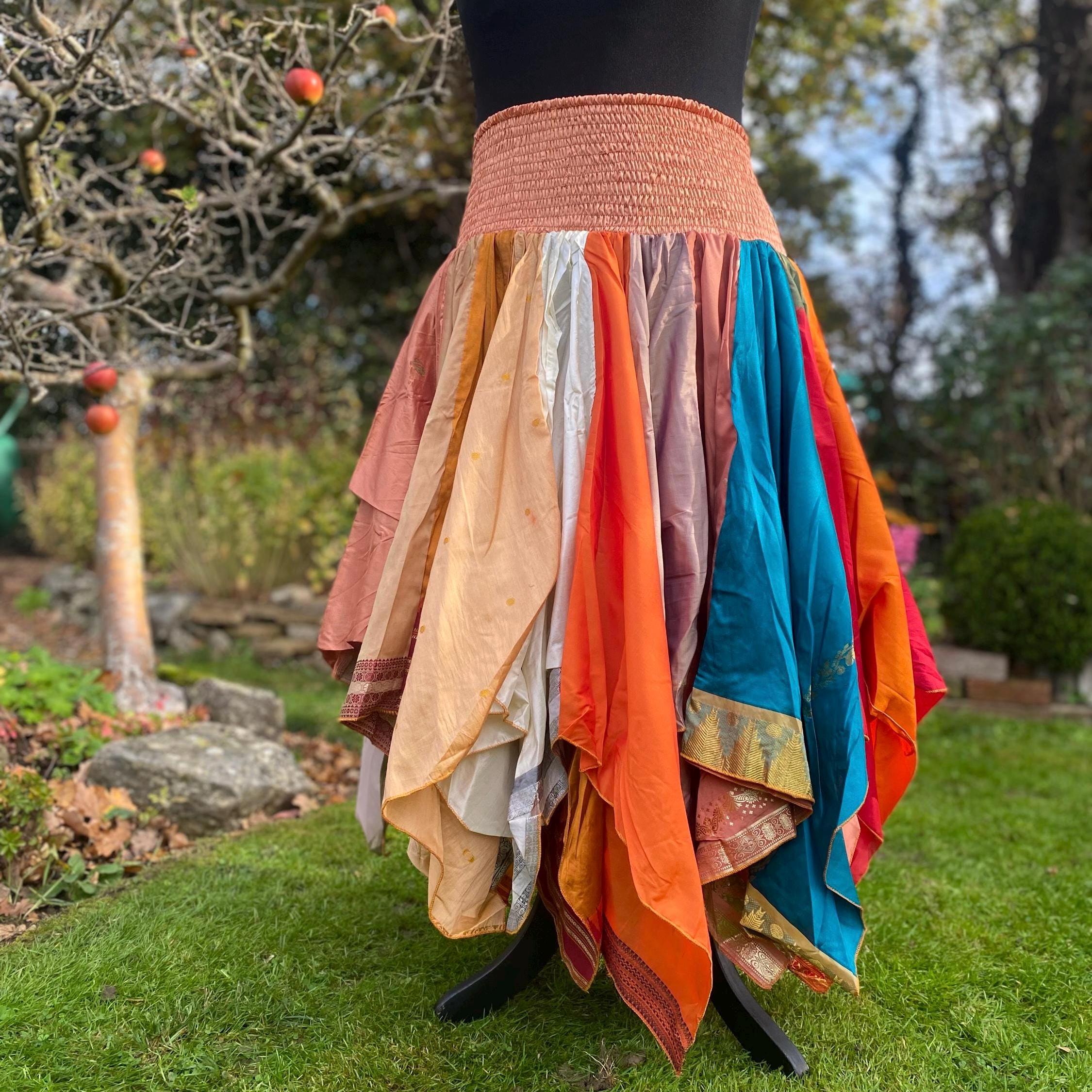 Suki Skirt - Heavier Vintage Sari Handkerchief Hem Skirt - Midi Length - Deep Shirred Elasticated Waistband - Cottagecore Fae Renfair - Plus Size