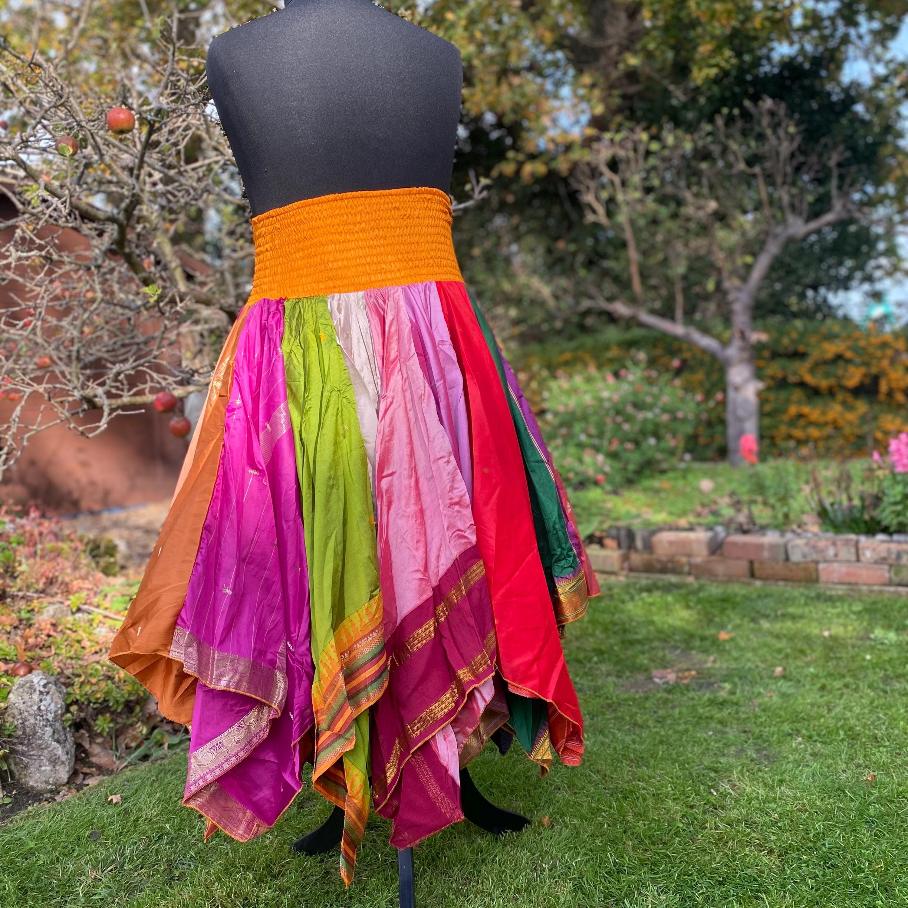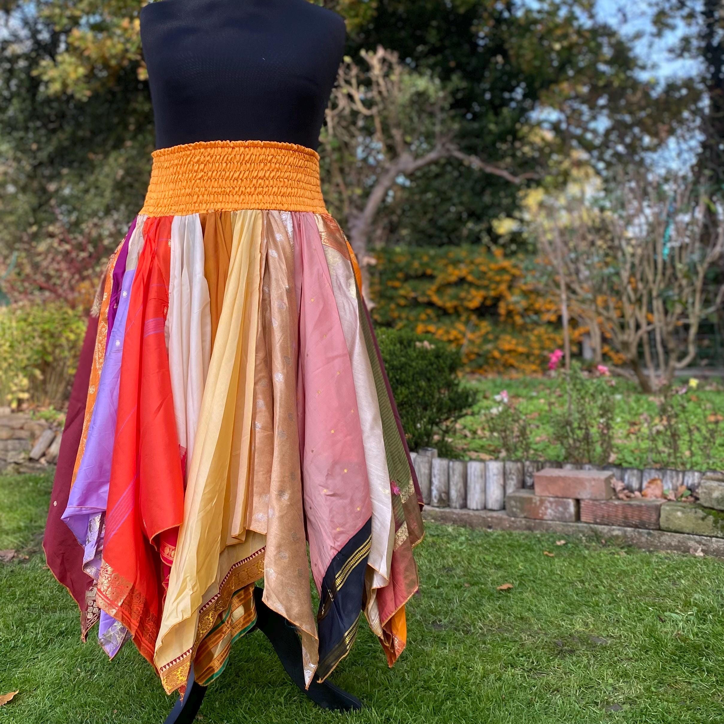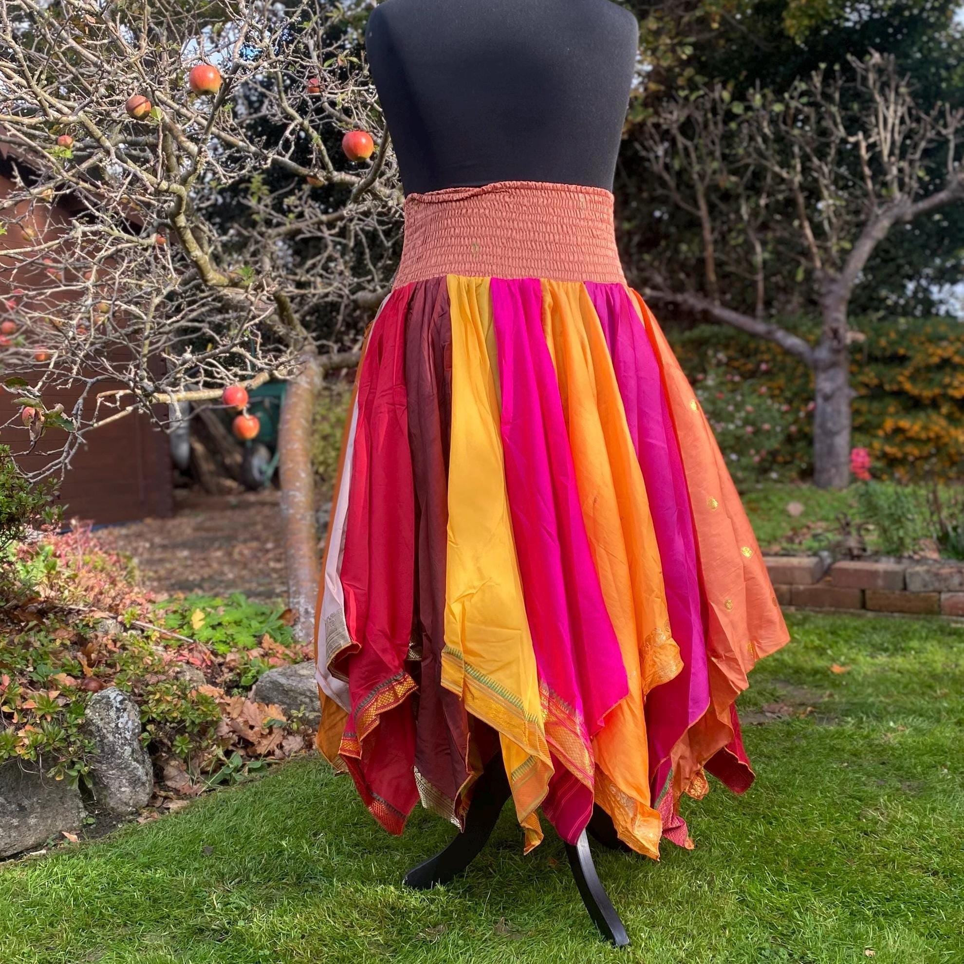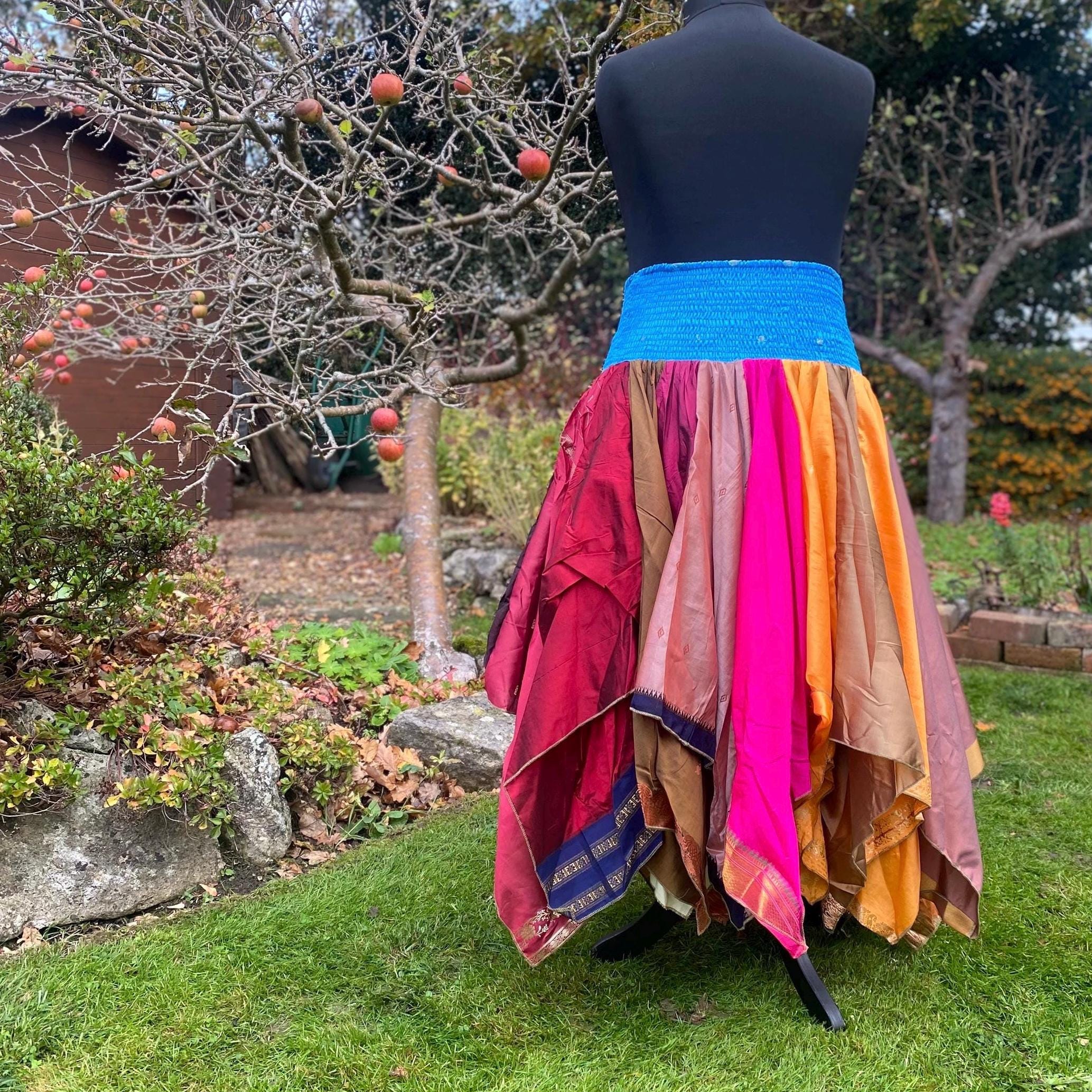Suki Skirt - Heavier Vintage Sari Handkerchief Hem Skirt - Midi Length - Deep Shirred Elasticated Waistband - Cottagecore Fae Renfair - Plus Size