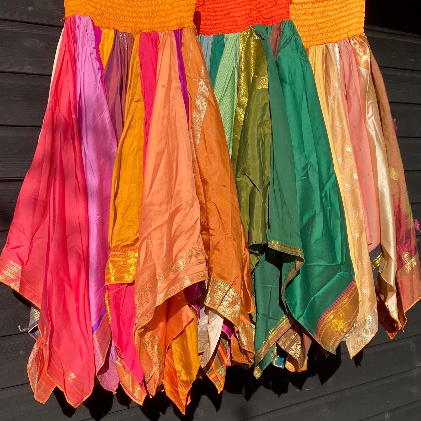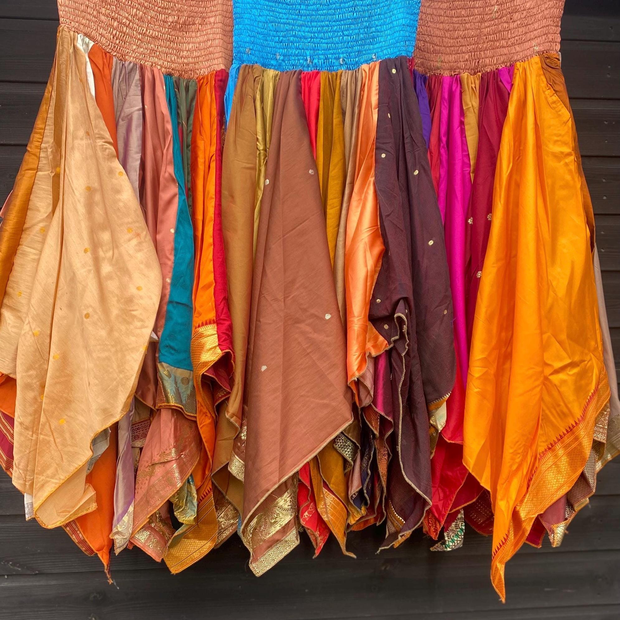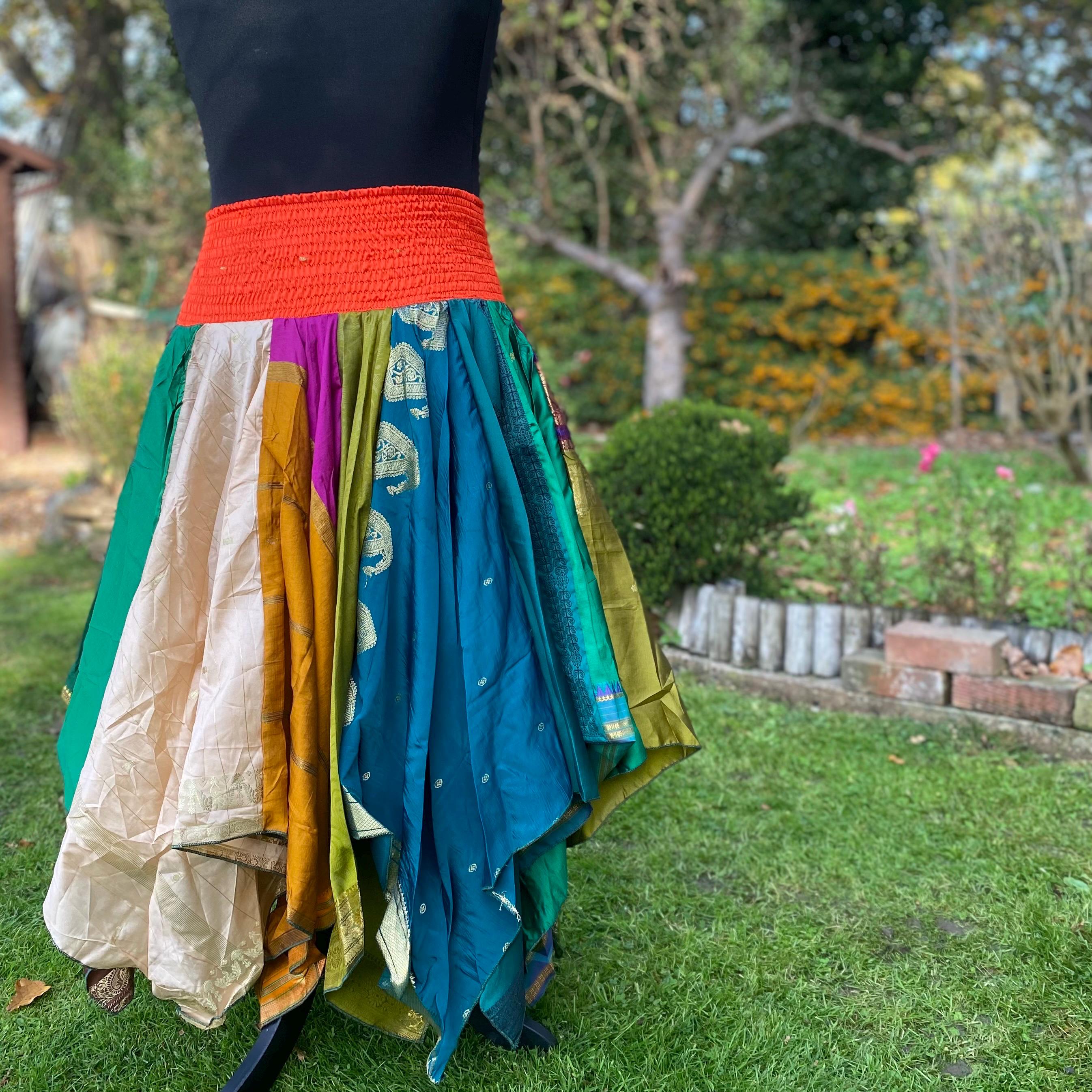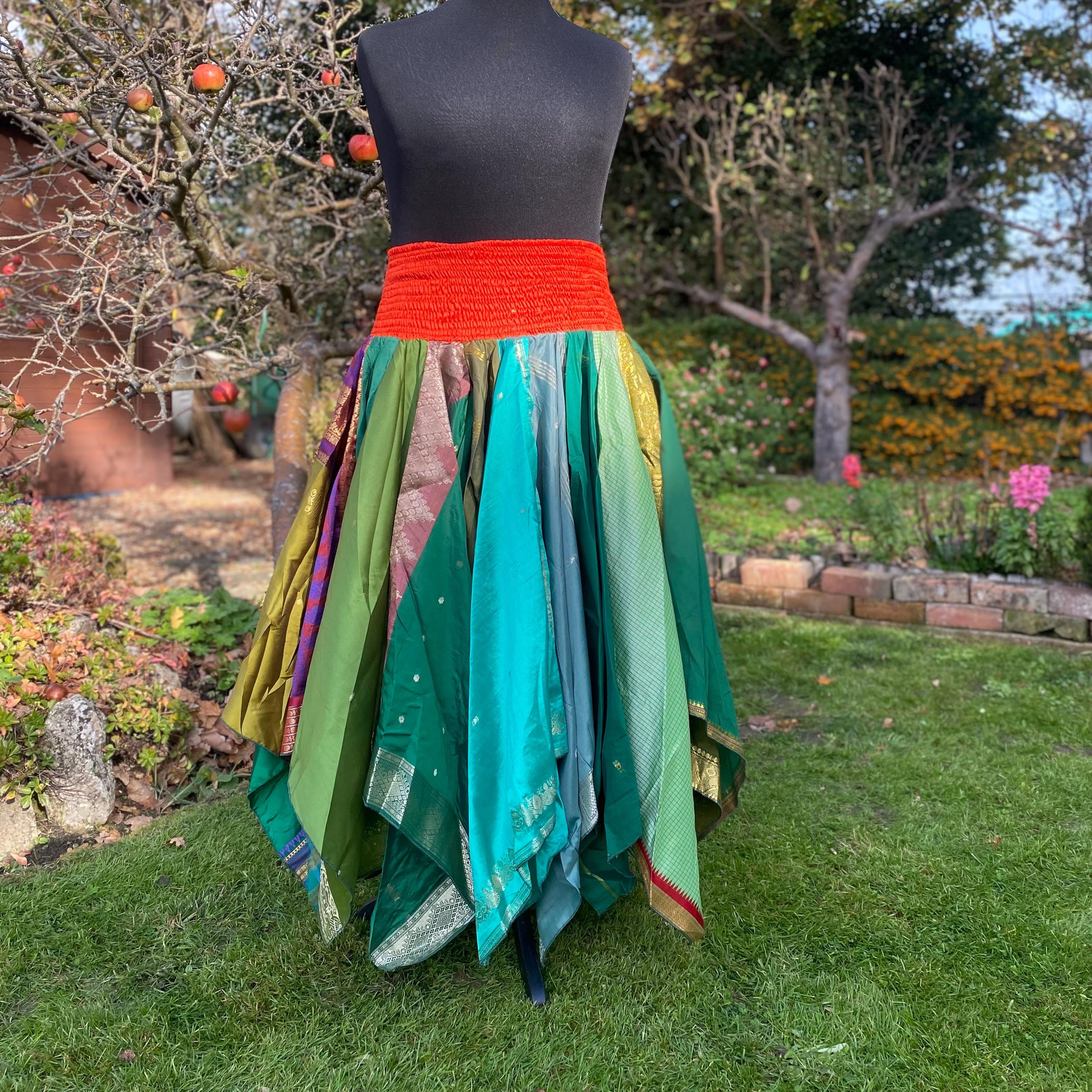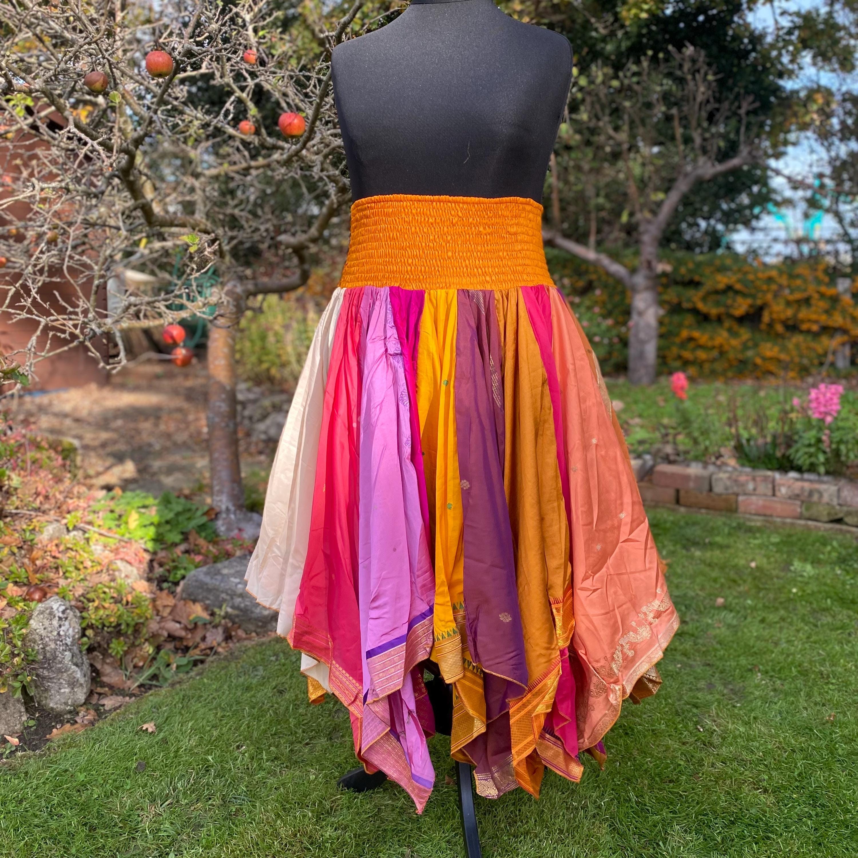 Suki Skirt - Heavier Vintage Sari Handkerchief Hem Skirt - Midi Length - Deep Shirred Elasticated Waistband - Cottagecore Fae Renfair - Plus Size