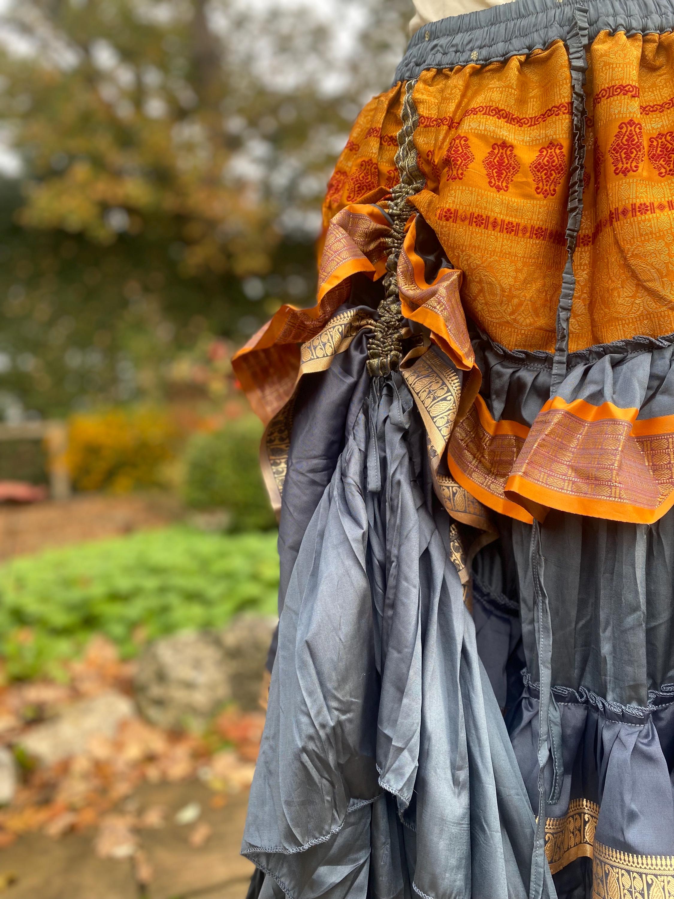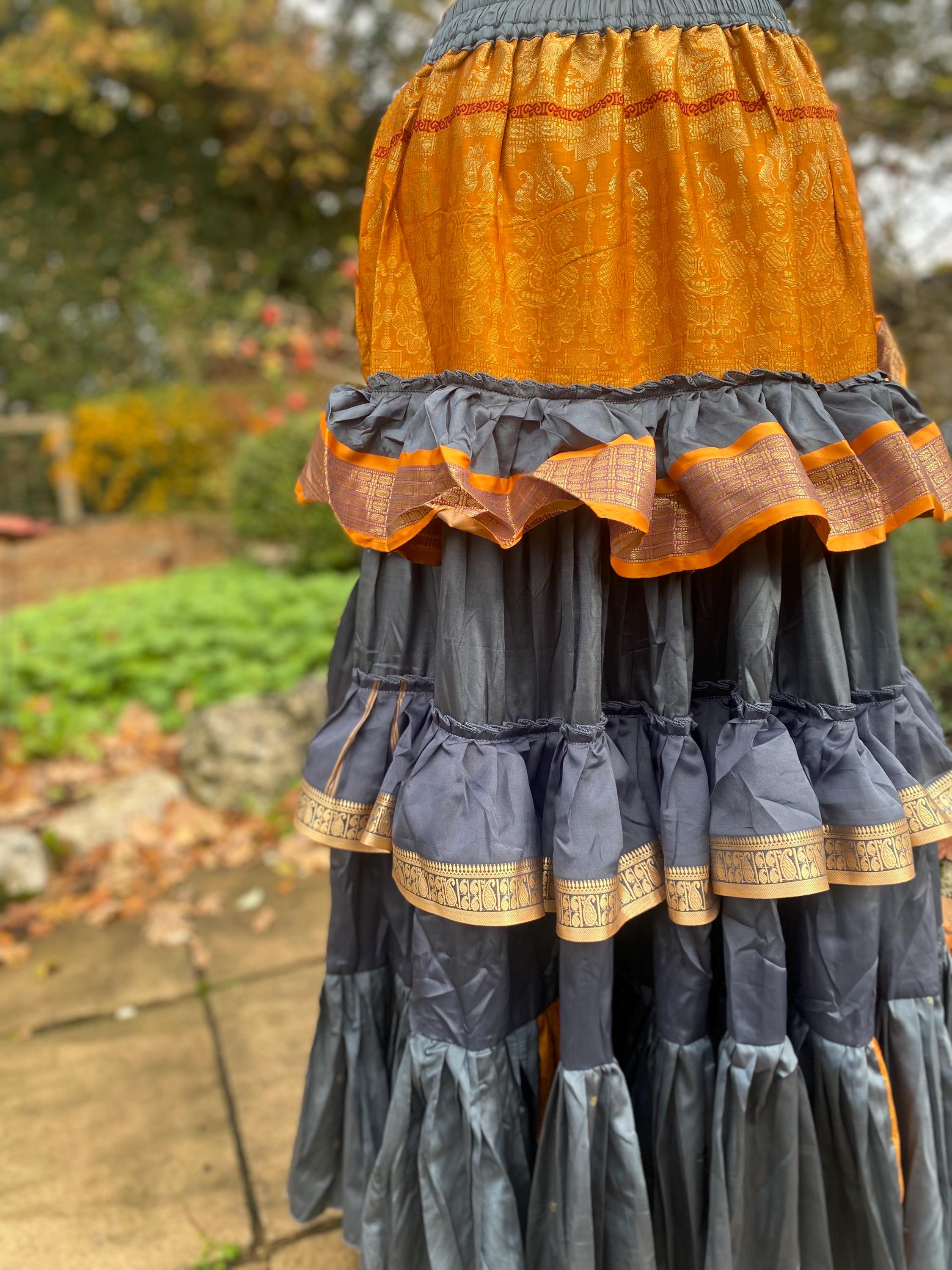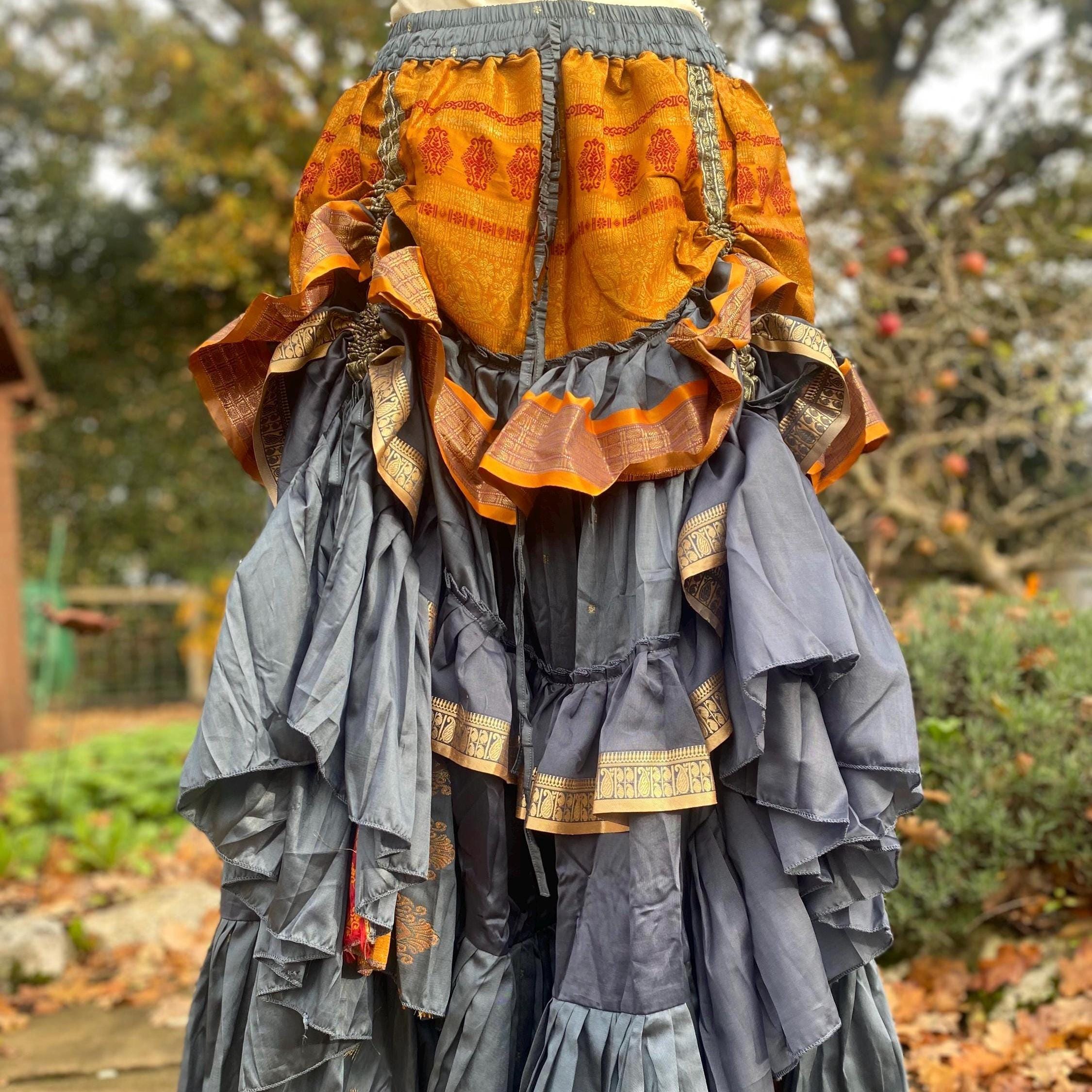 Tatiana 25 Yard Maxi Peasant Skirt Heavier Vintage Sari Grey Gold Dance Skirt Pirate Bellydance Cottagecore Saloon Girl