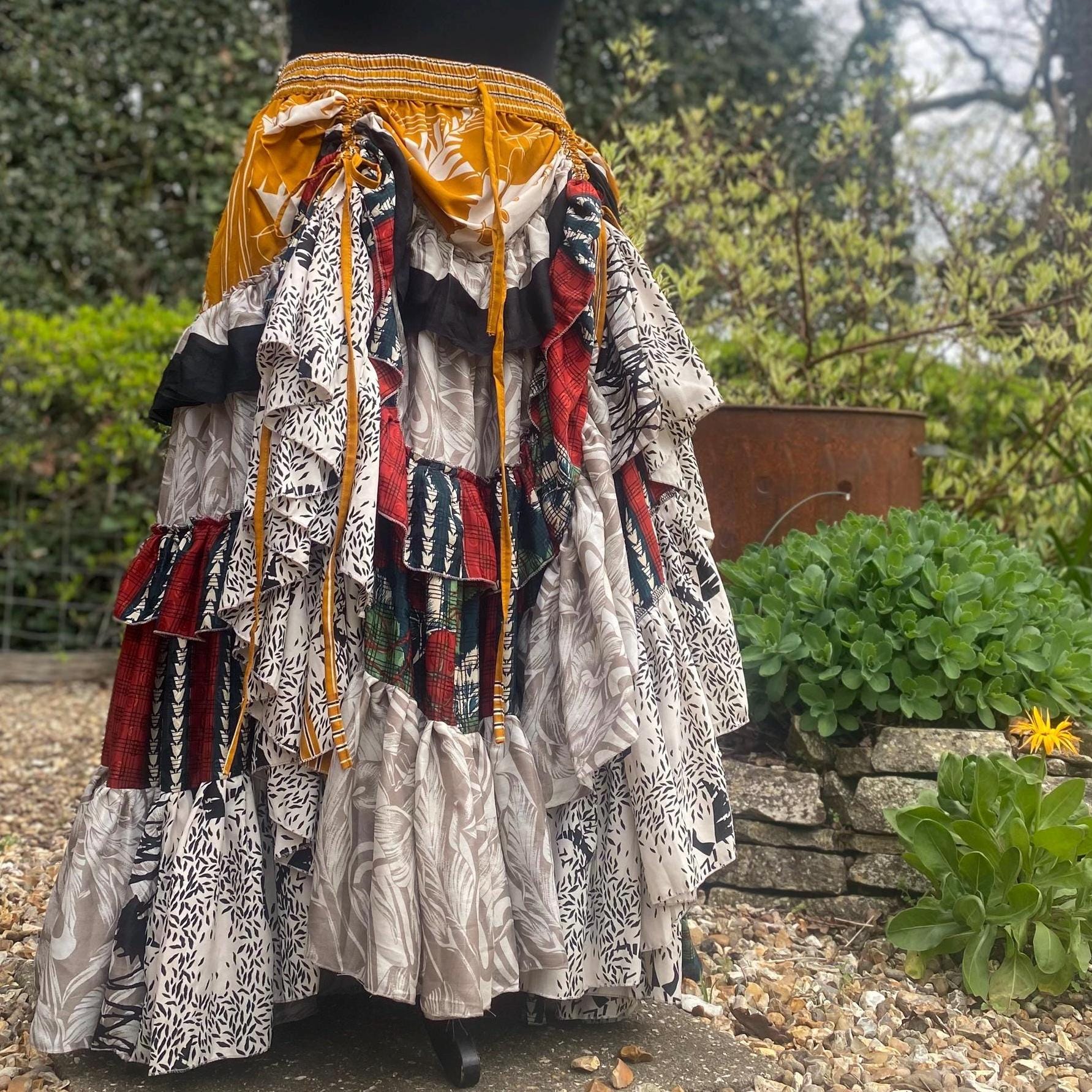 One Size 25 yard circle peasant style skirt with horizontal section tier hem frills, elasticated waist with additional an drawstring, plus two vertical drawstrings running down the front of each skirt so you can create your own ruched effect from a high/low hem to a full length peasant skirt.